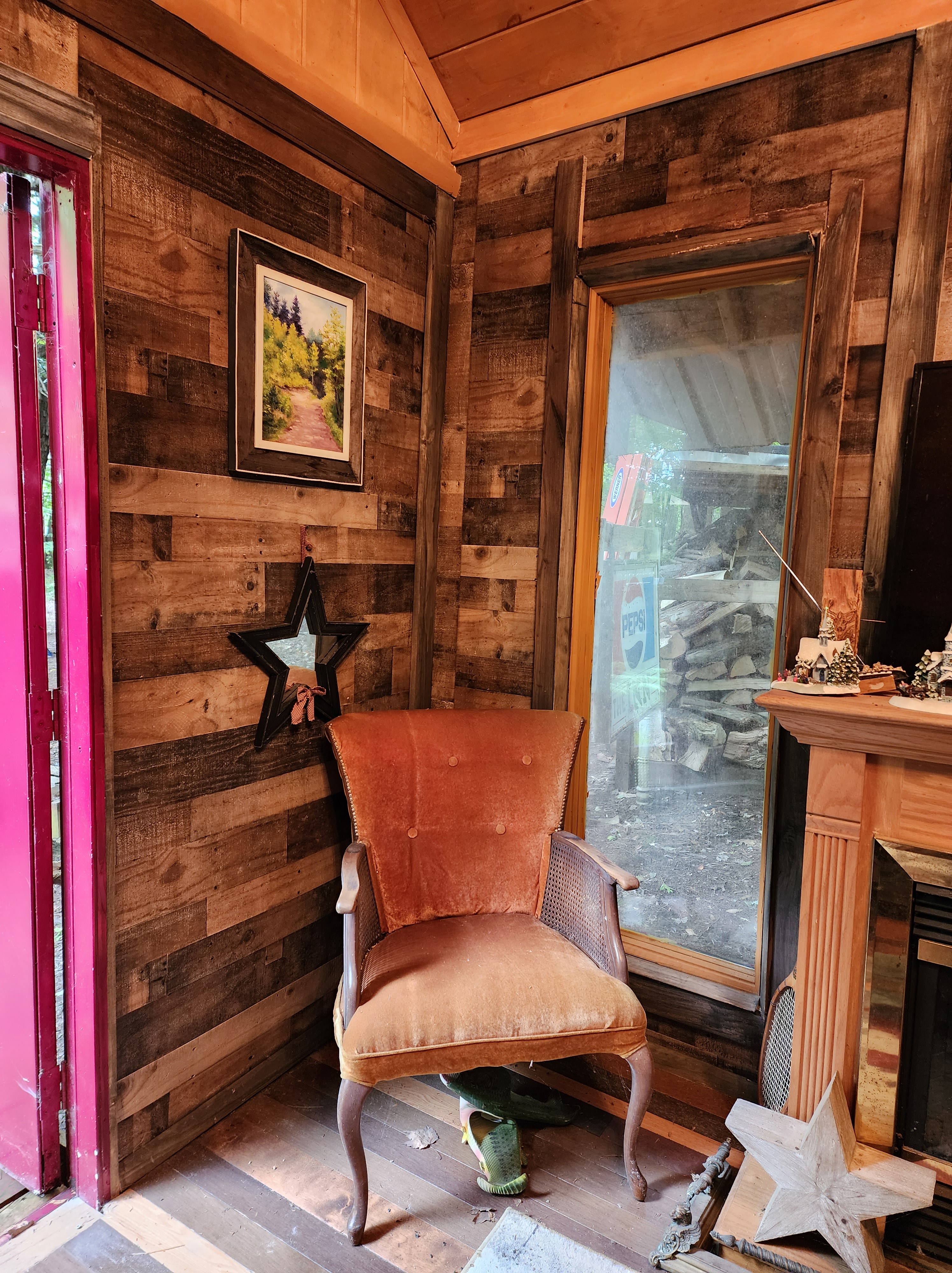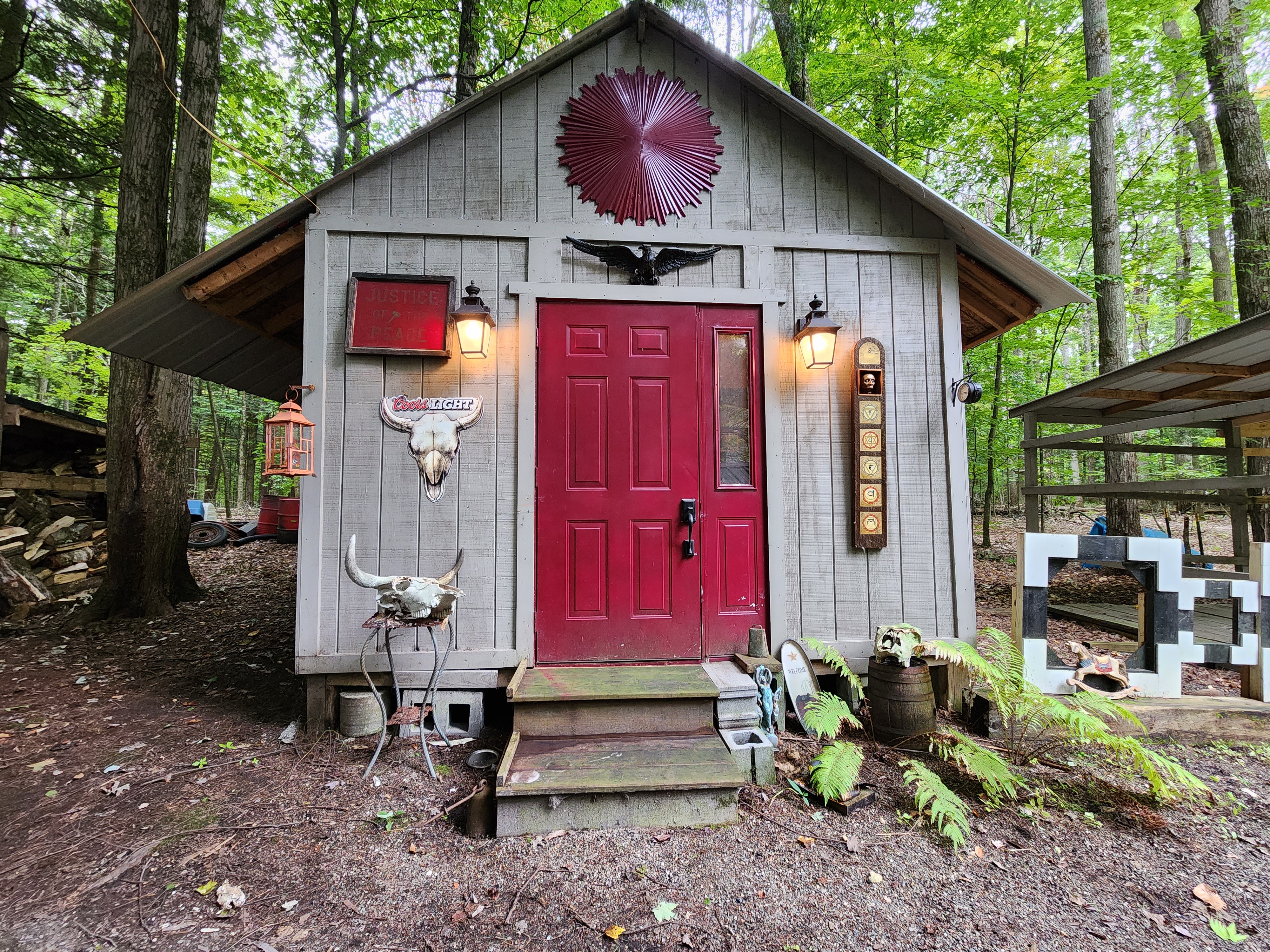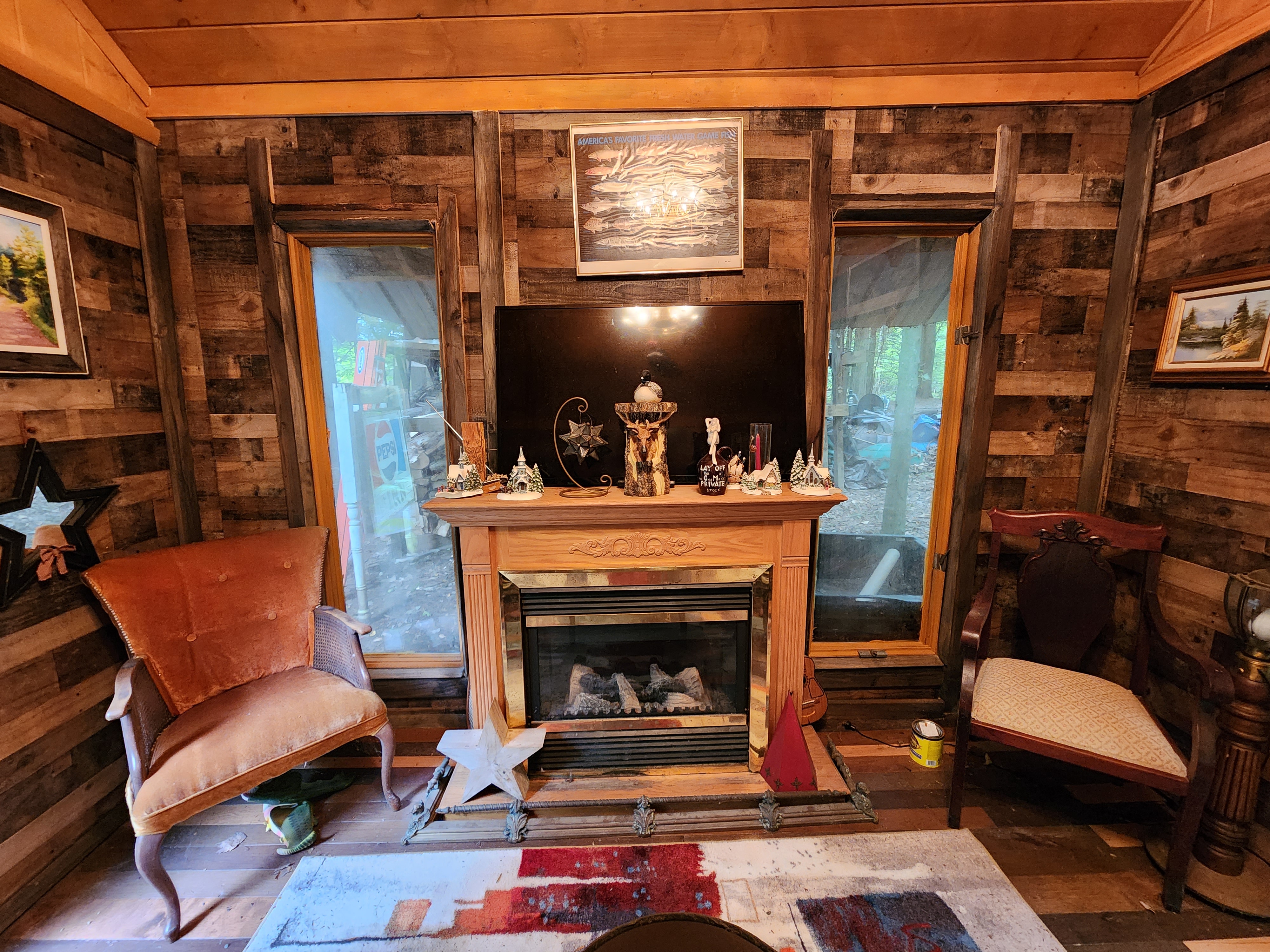 This little cabin is cozy and settled in the back woods of the property. The cabin has electricity, heat in the form of an electric fireplace, and a cute back porch that looks into the woods. The cabin is far enough from the house for privacy, but close enough to use the bathroom and kitchen, provided in the main home on the property.